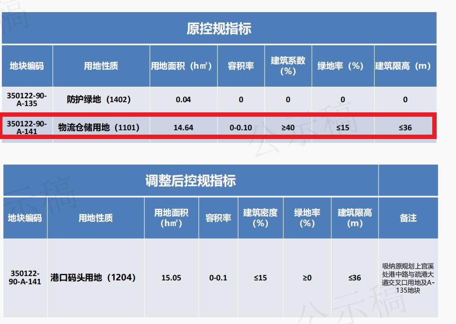 根据公布控规显示, 连江可门港经济区港区350122-90-A-141原为物流仓储用地, 调整后变为港口码头用地,用地面积15.05公顷,建筑限高36米, 吸纳原规划上宫溪处港中路与疏港大道交叉口用地及A-135地块。