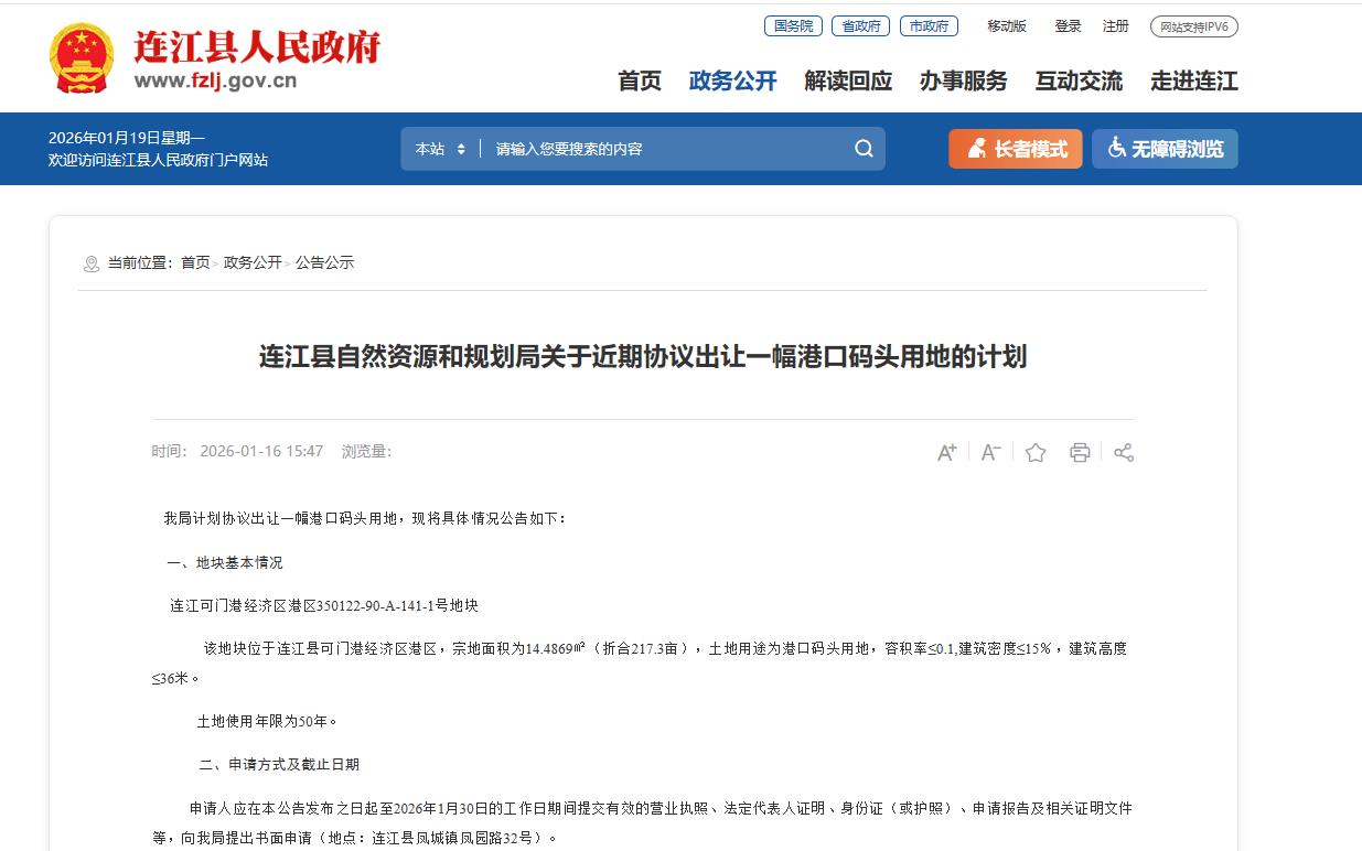 2026年1月16日,连江县人民政府官网发布“连江县自然资源和规划局关于近期协议出让一幅港口码头用地的计划 ”。