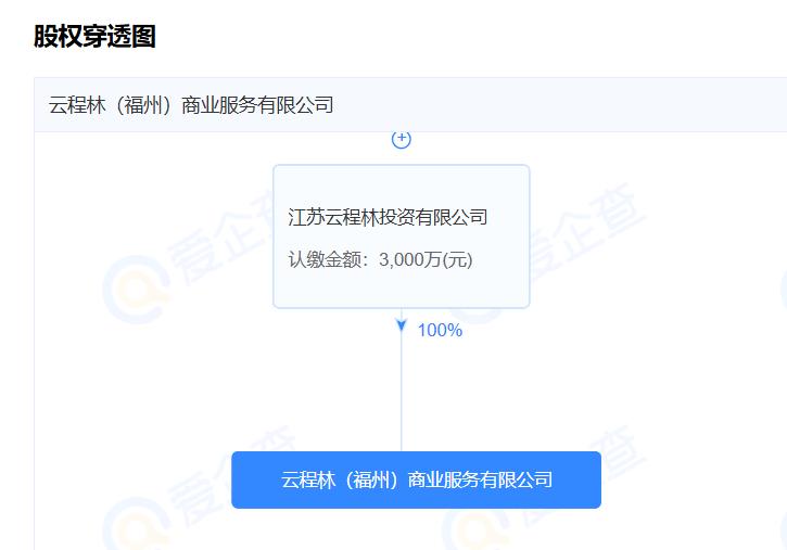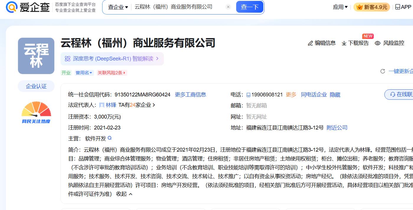 爱企查平台显示,云程林(福州)商业服务有限公司成立于2021年02月23日,注册地位于福建省连江县江南镇达江路3-12号,法定代表人为林锋。