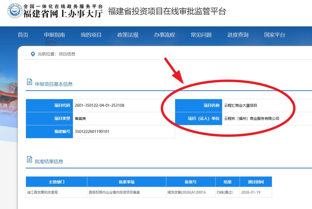 海西房产网(微信公众号:fjhxfcw)消息:福建省投资项目在线审批监管平台发布信息显示,“云程汇商业大厦项目”已于2026年1月19日取得县级权限内企业境内投资项目备案,批准结果信息为办结(通过)。