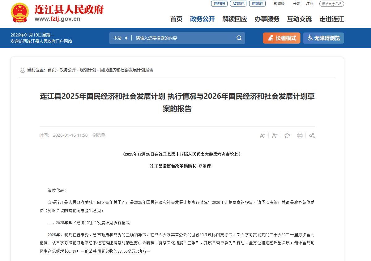 2026年1月16日,连江县官网发布“连江县2025年国民经济和社会发展计划 执行情况与2026年国民经济和社会发展计划草案的报告 ”。