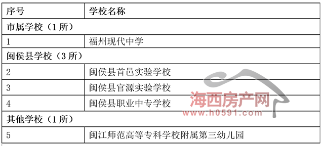 本次公布的学校名单共五所。其中,市属学校有福州现代中学;闽侯县学校三所,包括闽侯县首邑实验学校、闽侯县官源实验学校、闽侯县职业中专学校;其他学校,还有闽江师范高等专科学校附属第三幼儿园。