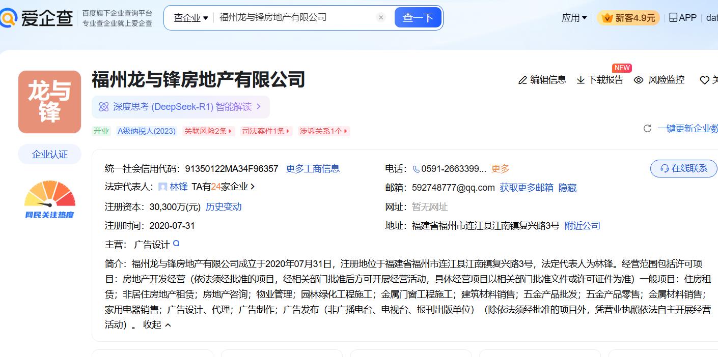 福州龙与锋房地产有限公司成立于2020年07月31日,注册地位于福建省福州市连江县江南镇复兴路3号,法定代表人为林锋。