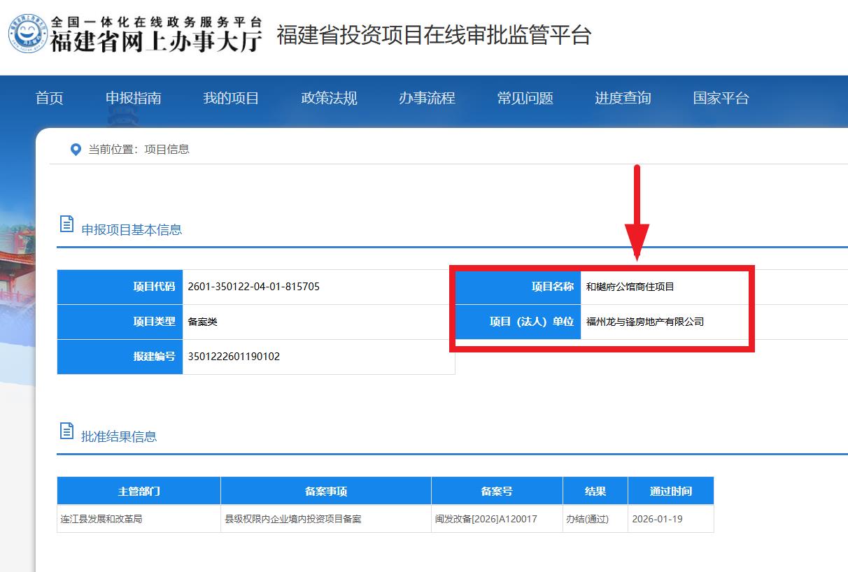 海西房产网(微信公众号:fjhxfcw)消息:福建省投资项目在线审批监管平台发布信息显示,“和樾府公馆商住项目”已于2026年1月19日取得县级权限内企业境内投资项目备案,批准结果信息为办结(通过)。