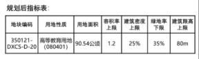 本次控规动态维护对原控规保留用地的相关指标进行赋值。该地块用途为高等教育用地,用地面积90.54公顷(1358.1亩),容积率上限1.2,建筑密度上限25%,绿地率下限35%,建筑限高80米。