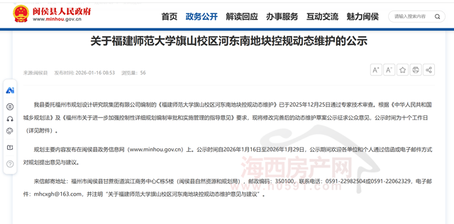 海西房产网(微信公众号:fjhxfcw)消息:1月16日,闽侯县官网发布“关于福建师范大学旗山校区河东南地块控规动态维护的公示”。