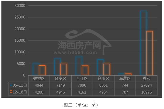 图二为206年1月5日-18日福州五行政区住宅签约套数对比图。上周福州五区住宅签约18976㎡,环比前一周减少8718㎡,降幅为31.47%。