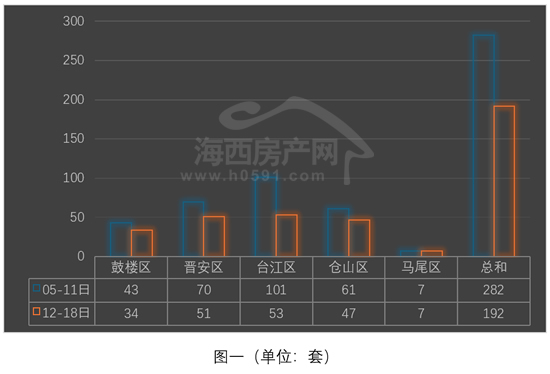图一为206年1月5日-18日福州五行政区住宅签约套数对比图。上周福州五区住宅签约192套,环比前一周减少90套。