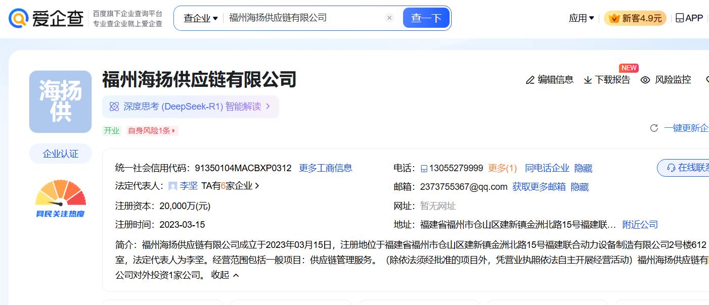 爱企查平台显示,福州海扬供应链有限公司成立于2023年03月15日,注册地位于福建省福州市仓山区建新镇金洲北路15号福建联合动力设备制造有限公司2号楼612室,法定代表人为李坚。