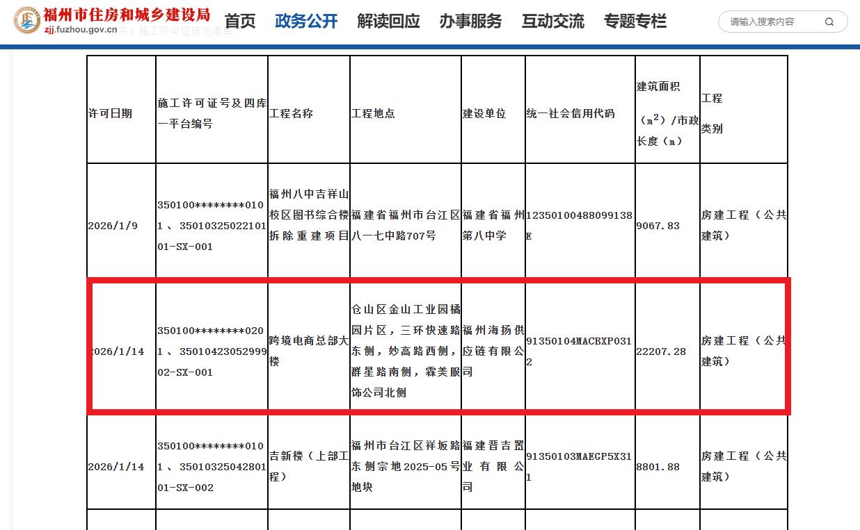 信息显示,跨境电商总部大楼 ,工程地点位于仓山区金山工业园橘园片区,三环快速路东侧,妙高路西侧,群星路南侧,霖美服饰公司北侧,建筑单位为福州海扬供应链有限公司,统一社会信用代码 91350104MACBXP0312 ,建筑面积22207.28平米,工程类别房建工程(公共建筑) 。