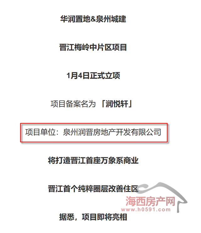 公开资料显示,泉州润晋房地产开发有限公司将开发晋江梅岭中片区项目,该项目于1月4日正式立项,备案名为 「润悦轩」,将打造晋江首座万象系商业,晋江首个纯粹圈层改善住区。
