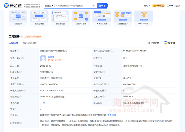 海西房产网(微信公众号:fjhxfcw)消息:爱企查显示,泉州润晋房地产开发有限公司于2026年1月2日注册成立,注册地位于福建省晋江市晋宁路1555号岭航天翊山庄晋江市梅岭商会总部6楼603室,注册资本为12亿元,法定代表人为高昕冉。