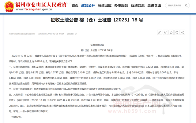 海西房产网(微信公众号:fjhxfcw)消息:近日,仓山区自然资源和规划局发布榕(仓)土征告〔2025〕18 号土地征收公告。