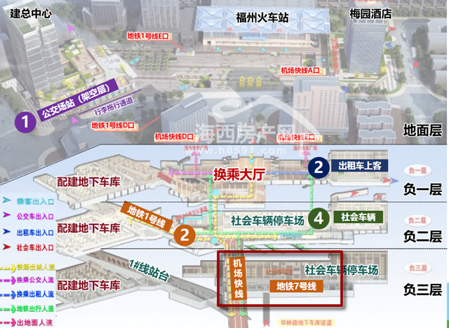 此次,福州住建局公布的示意图显示,地铁7号线已经提前预留,也就意味着后续福州火车站将有地铁1号线、滨海快线,地铁7号线三条线路同台换乘。