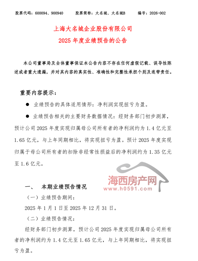 海西房产网(微信公众号:fjhxfcw)消息:1月22日,上海大名城企业股份有限公司对外发布“2025年度业绩预告的公告”。