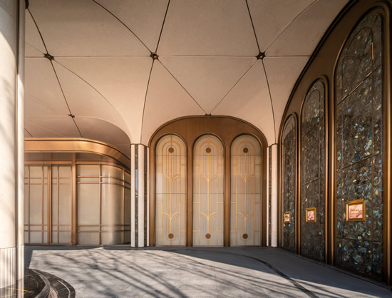在整体约65米长、17米高的超星级酒店式门庭设计上,设计大师们灵感来自朱熹鼓山石刻,严选同一脉矿藏的蓝翡翠奢石景墙,把一份“改善级产品”的威仪全面做足。