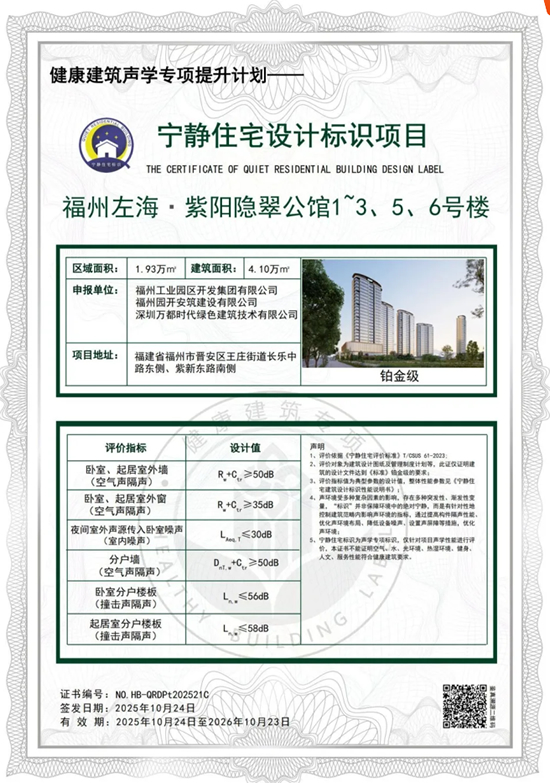 在此之前,“左海·紫阳隐翠” 已经为福州楼市赢得一次全国性关注,项目获得由中国城市科学研究会颁发的宁静住宅“铂金级”认证,成为目前国内宁静健康住宅的最高等级认证。