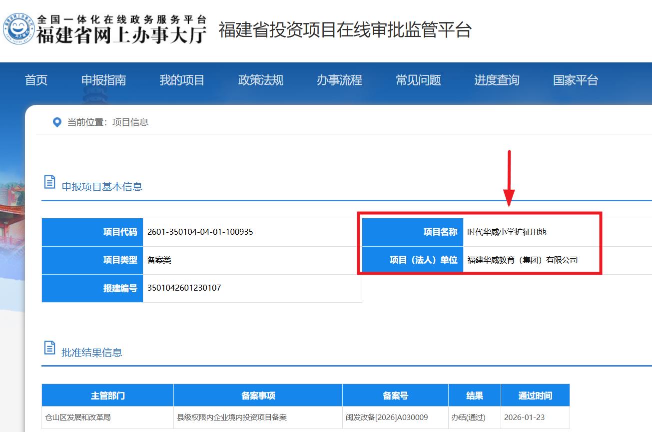 海西房产网(微信公众号:fjhxfcw)消息:福建省投资项目在线审批监管平台发布信息显示,“时代华威小学扩征用地”已于2026年1月23日取得县级权限内企业境内投资项目备案,批准结果信息为办结(通过)。
