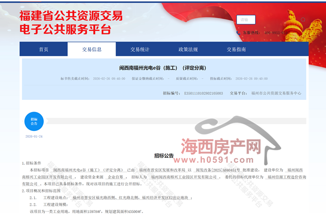 海西房产网(微信公众号:fjhxfcw)消息:福建省公共资源交易电子公共服务平台发布“闽西南福州光电e谷(施工)招标公告”。
