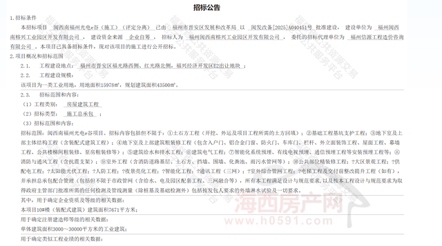 招标公告显示,闽西南福州光电e谷(施工)(评定分离)已经获批,建设单位为福州闽西南榕兴工业园区开发有限公司,本项目已具备招标条件,现对该项目的施工进行公开招标。