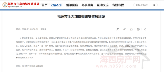 海西房产网(微信公众号:fjhxfcw)消息:1月26日,福州市住房和城乡建设局官网刊发一则消息,介绍福州市全力加快棚改安置房建设最新情况: