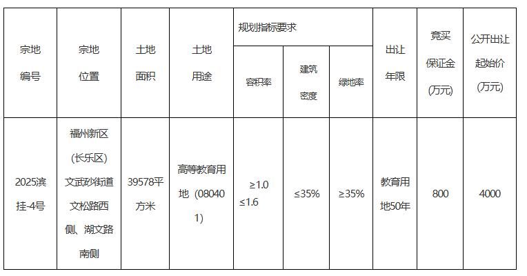 2025滨挂-4号,地块位于福州新区(长乐区)文武砂街道文松路西侧、湖文路南侧,土地面积39578平方米。土地性质高等教育用地(080401)。出让年限教育用地50年。