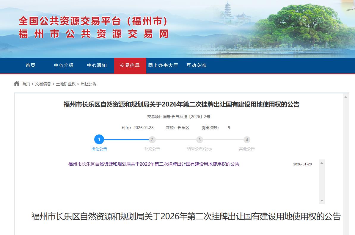 海西房产网(微信公众号:fjhxfcw)消息:2026年1月28日,福州市长乐区自然资源和规划局发布“关于2026年第二次挂牌出让国有建设用地使用权的公告”。
