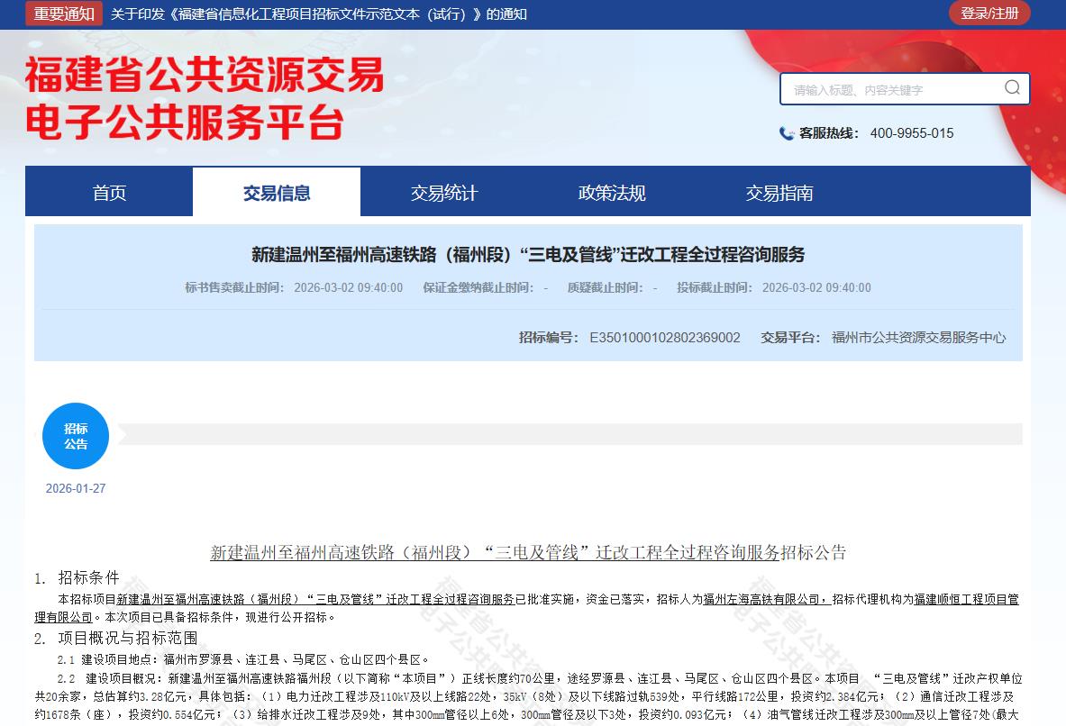 海西房产网(微信公众号:fjhxfcw)消息:2026年1月27日,福州市公共资源交易服务中心发布新建温州至福州高速铁路(福州段)“三电及管线”迁改工程全过程咨询服务招标公告。