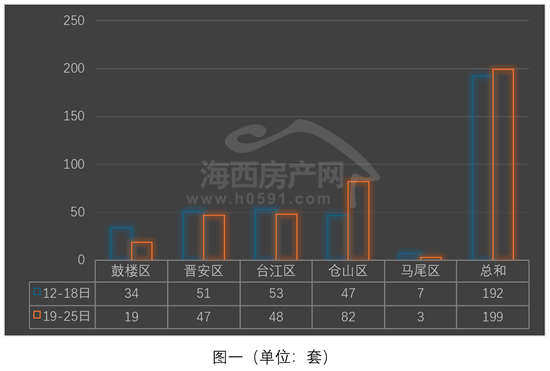 图一为2026年1月12日-25日福州五行政区住宅签约套数对比图。上周福州五区住宅签约199套,环比前一周增加7套。