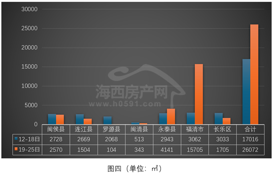 图四为2026年1月12日-25日福州下辖七县(市)区住宅签约面积对比图。上周福州七县(市)区签约26072㎡,环比前一周增加9056㎡,增幅为53.22%。