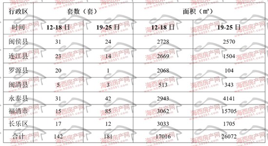 表二为2025年12月29日-2026年1月25日福州下辖七县(市)区住宅签约明细表。上周福州七县(市)区签约181套,环比前一周增加39套。