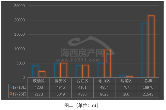 剩下的“鼓楼区”和“马尾区”分别签约2173㎡和360㎡,环比前一周双双下降。