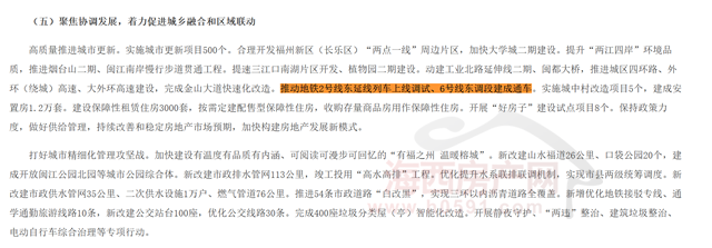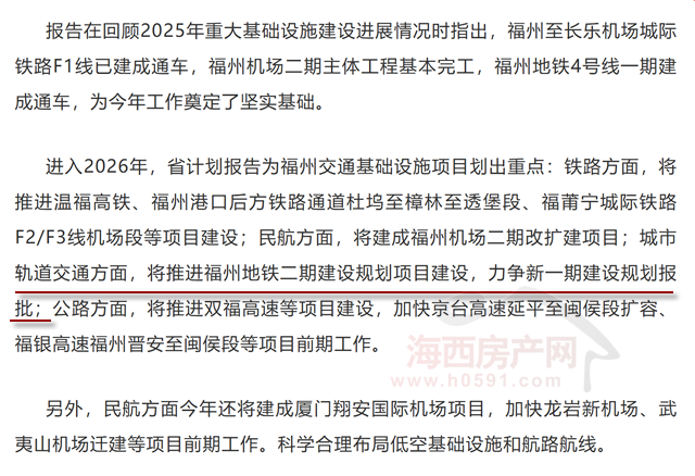 报告在回顾2025年重大基础设施建设进展情况时指出,福州至长乐机场城际铁路F1线已建成通车,福州机场二期主体工程基本完工,福州地铁4号线一期建成通车,为今年工作奠定了坚实基础。