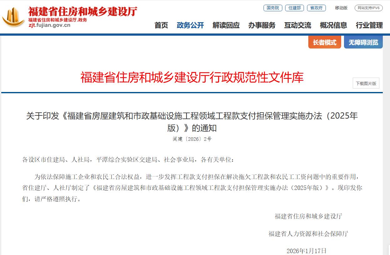 为依法保障施工企业和农民工合法权益,进一步发挥工程款支付担保在解决拖欠工程款和农民工工资问题中的重要作用,省住建厅、人社厅制定了《福建省房屋建筑和市政基础设施工程领域工程款支付担保管理实施办法(2025年版)》。要求相关部门,请严格遵照执行。
