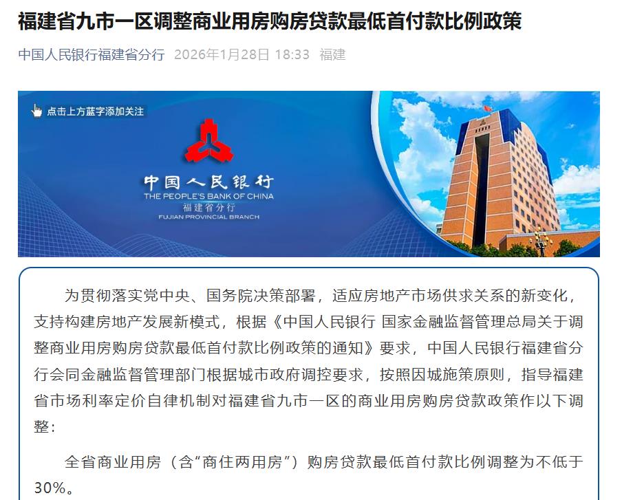 海西房产网(微信公众号:fjhxfcw)消息:2026年1月28日,中国人民银行福建省分行发布“福建省九市一区调整商业用房购房贷款最低首付款比例政策”。