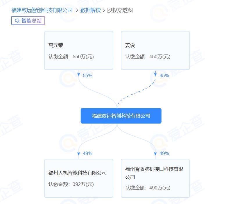 该公司对外投资有两家子公司,各持股49%。分别为福州人机智能科技有限公司、福州智驭脑机接口科技有限公司。