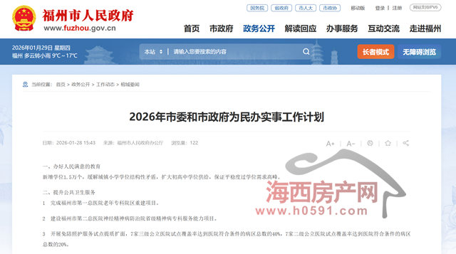 海西房产网(微信公众号:fjhxfcw)消息:1月28日,福州市人民政府办公厅发布“2026年市委和市政府为民办实事工作计划”。