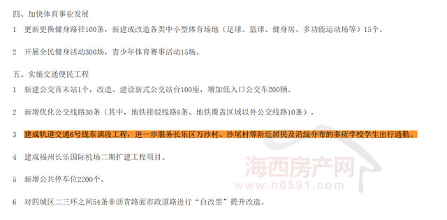 在实施交通便民工程方面,明确今年建成轨道交通6号线东调段工程,进一步服务长乐区万沙村、沙尾村等附近居民及沿线分布的多所学校学生出行通勤。
