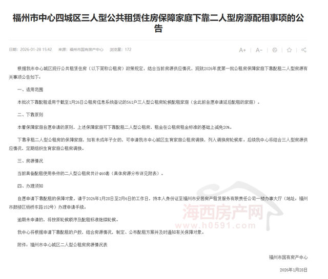 根据福州市中心城区现行公共租赁住房(以下简称公租房)政策规定,结合当前房源供应情况,现就2026年度第一批公租房保障家庭下靠配租二人型房源有关事项公告如下: