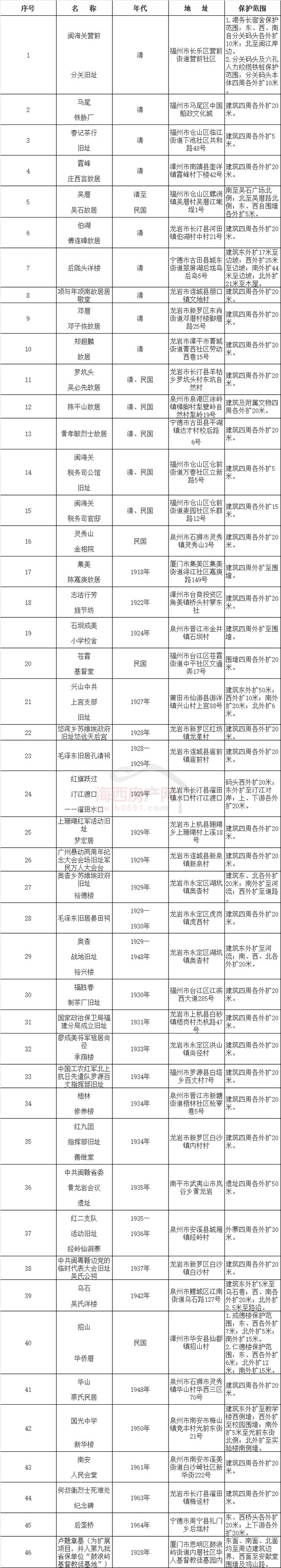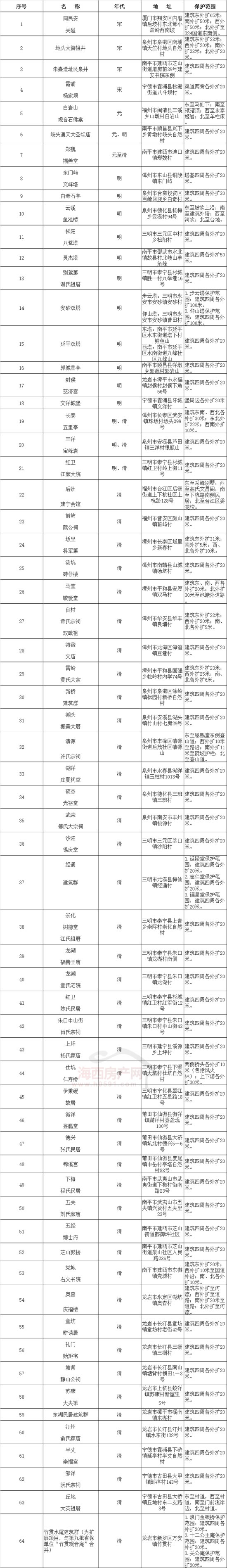 福建省第十一批省级文物保护单位名单及保护范围