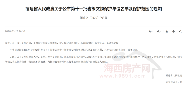 海西房产网(微信公众号:fjhxfcw)消息:近日,福建省人民政府下发“关于公布第十一批省级文物保护单位名单及保护范围的通知(闽政文〔2025〕293号)”。