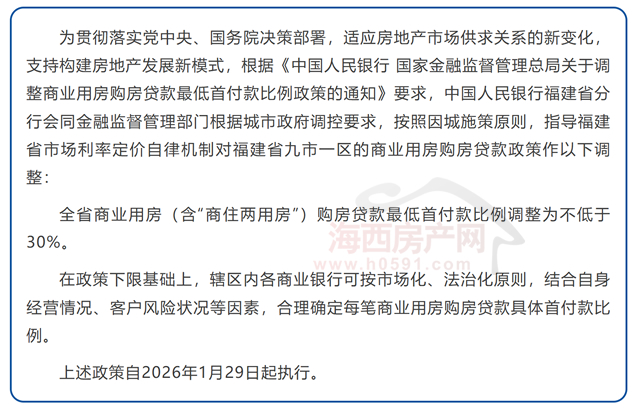 为贯彻落实党中央、国务院决策部署,适应房地产市场供求关系的新变化,支持构建房地产发展新模式,根据《中国人民银行 国家金融监督管理总局关于调整商业用房购房贷款最低首付款比例政策的通知》要求,中国人民银行福建省分行会同金融监督管理部门根据城市政府调控要求,按照因城施策原则,指导福建省市场利率定价自律机制对福建省九市一区的商业用房购房贷款政策作以下调整: