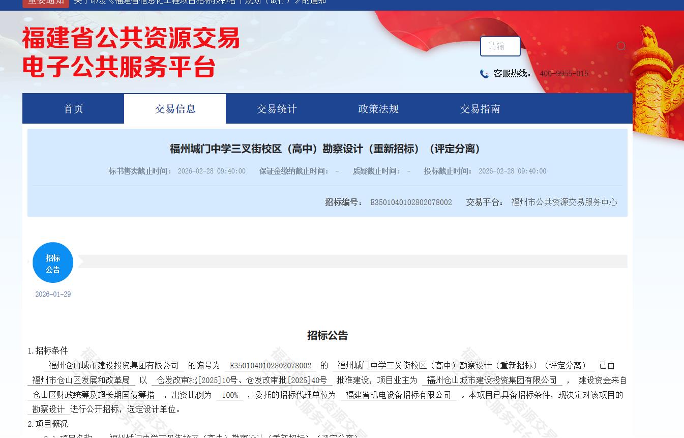 海西房产网(微信公众号:fjhxfcw)消息:2026年1月29日,福州市公共资源交易服务中心发布“福州城门中学三叉街校区(高中)勘察设计(重新招标)(评定分离)”。