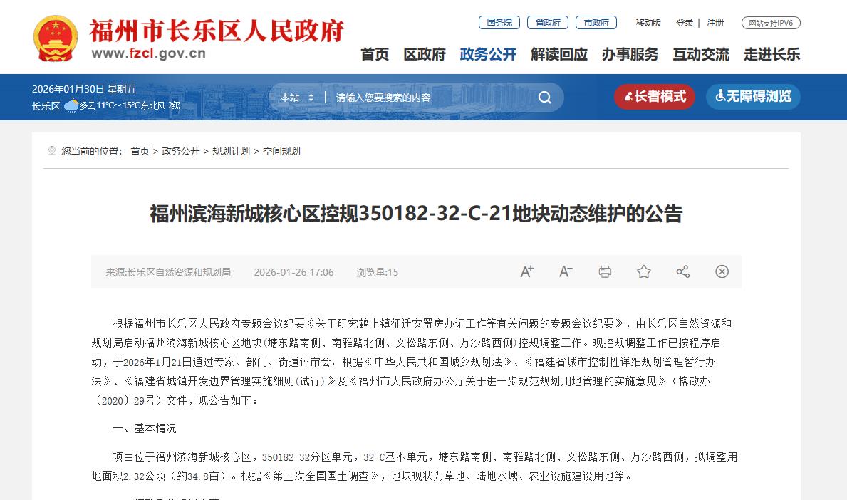 2026年1月26日,长乐区自然资源和规划局发布“福州滨海新城核心区控规350182-32-C-21地块动态维护的公告 ”。