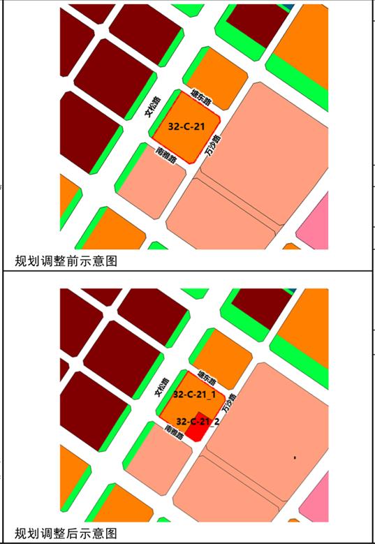 1、用地调整。将32-C-21地块拆分为32-C-21_1地块和32-C-21_2地块,其中32-C-21_2地块用地性质由二类住宅、商业、商务混合用地(R21B1B2)调整为商业用地(B1/0901),32-C-21_1地块用地性质保持不变。