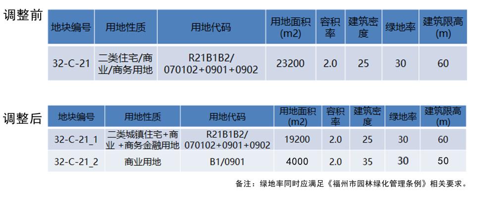 2、指标调整。衔接滨海新城核心区城市设计,调整后32-C-21_2地块,用地面积4000平方米,建筑密度由≤25%调整为≤35%、建筑限高由≤60米调整为≤50米,其余规划指标保持不变;32-C-21_1地块,用地面积19200平方米,其余规划指标保持不变。绿地率同时应满足《福州市园林绿化管理条例》及省市关于绿地率控制的相关要求,建筑限高应符合机场净空保护要求及民航安监局要求。
