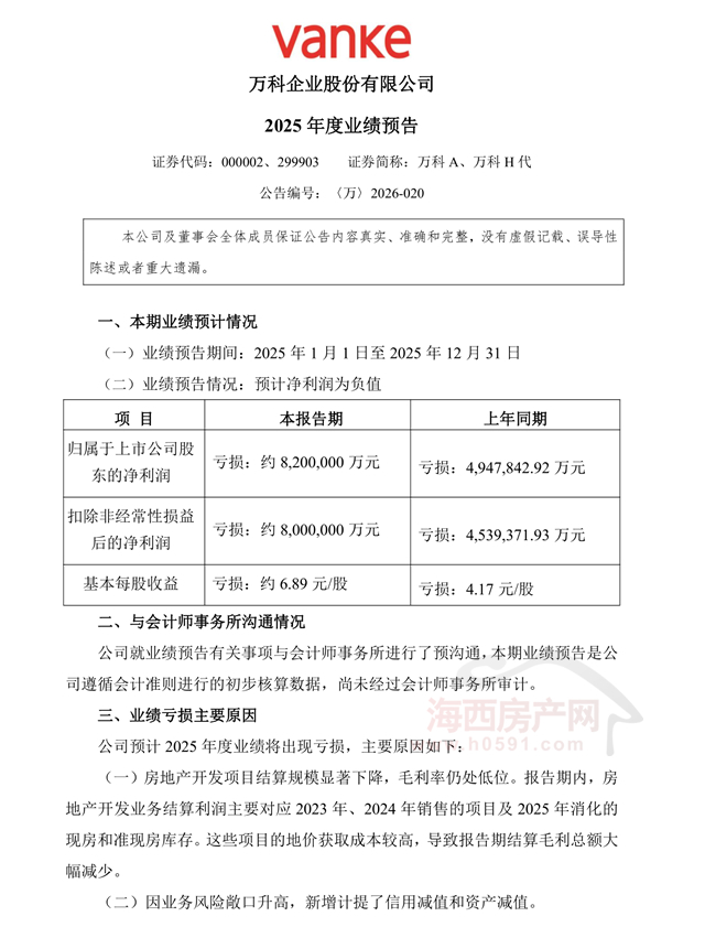 海西房产网(微信公众号:fjhxfcw)消息:1月30日,万科企业股份有限公司发布“2025年度业绩预告”。