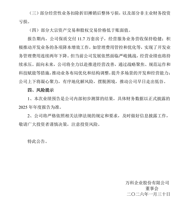 万科在公告中指出,公司预计2025年度业绩将出现亏损,主要原因包括四个方面: