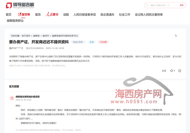海西房产网(微信公众号:fjhxfcw)消息:近日,有业主通过人民网领导留言板投诉: