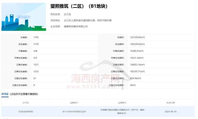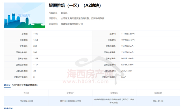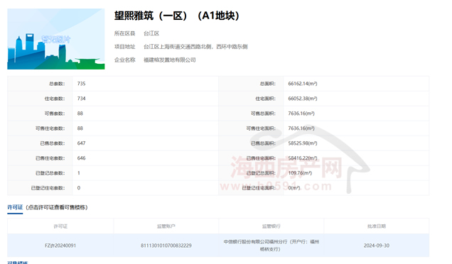 福州市不动产登记交易平台显示,截止2026年2月1日,望熙雅筑(一区)(A1地块)可售住宅88套;望熙雅筑(一区)(A2地块)可售住宅200套;望熙雅筑(二区)(B1地块)可售住宅237套。